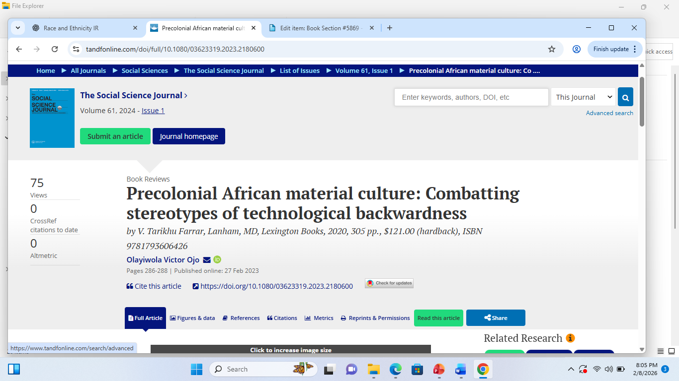 Ojo, Olayiwola Victor (2024) Precolonial African material culture: Combatting stereotypes of technological backwardness: by V. Tarikhu Farrar, Lanham, MD, Lexington Books,. The Social Science Journal, 61 (1). pp. 286-288. ISSN 1873-5355