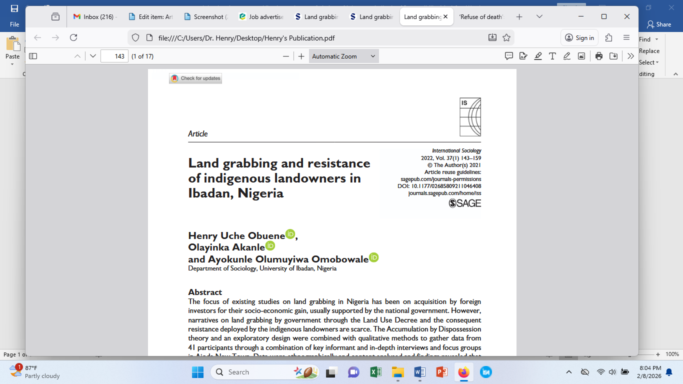 Obuene, Henry Uche and Akanle, Yinka and Omobowale, Ayokunle Olumuyiwa (2021) Land grabbing and resistance of indigenous landowners in Ibadan, Nigeria. International Sociology, 37 (1). pp. 143-159.