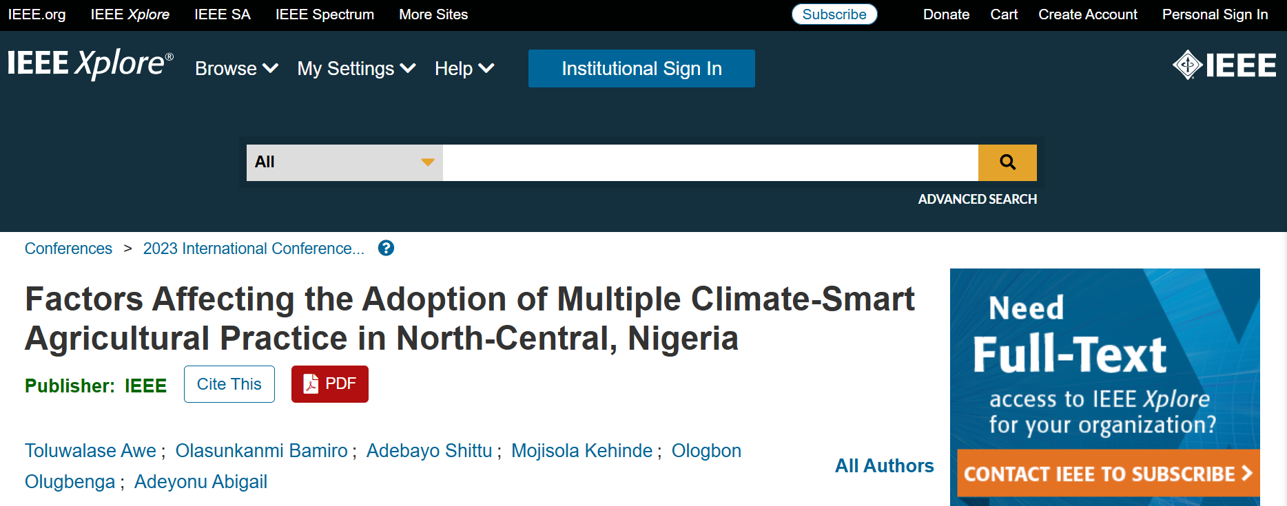 Additional Information: This is a peer-reviewed IEEE conference paper that examines factors influencing the likelihood and intensity of adoption of multiple climate-smart agricultural practices in North-Central Nigeria using secondary survey data. The study applies a multivariate probit model for joint adoption decisions and an ordered probit model for adoption intensity, highlighting key roles of credit access, cooperative membership and marital status, with adoption differences observed between Nasarawa and Benue States.